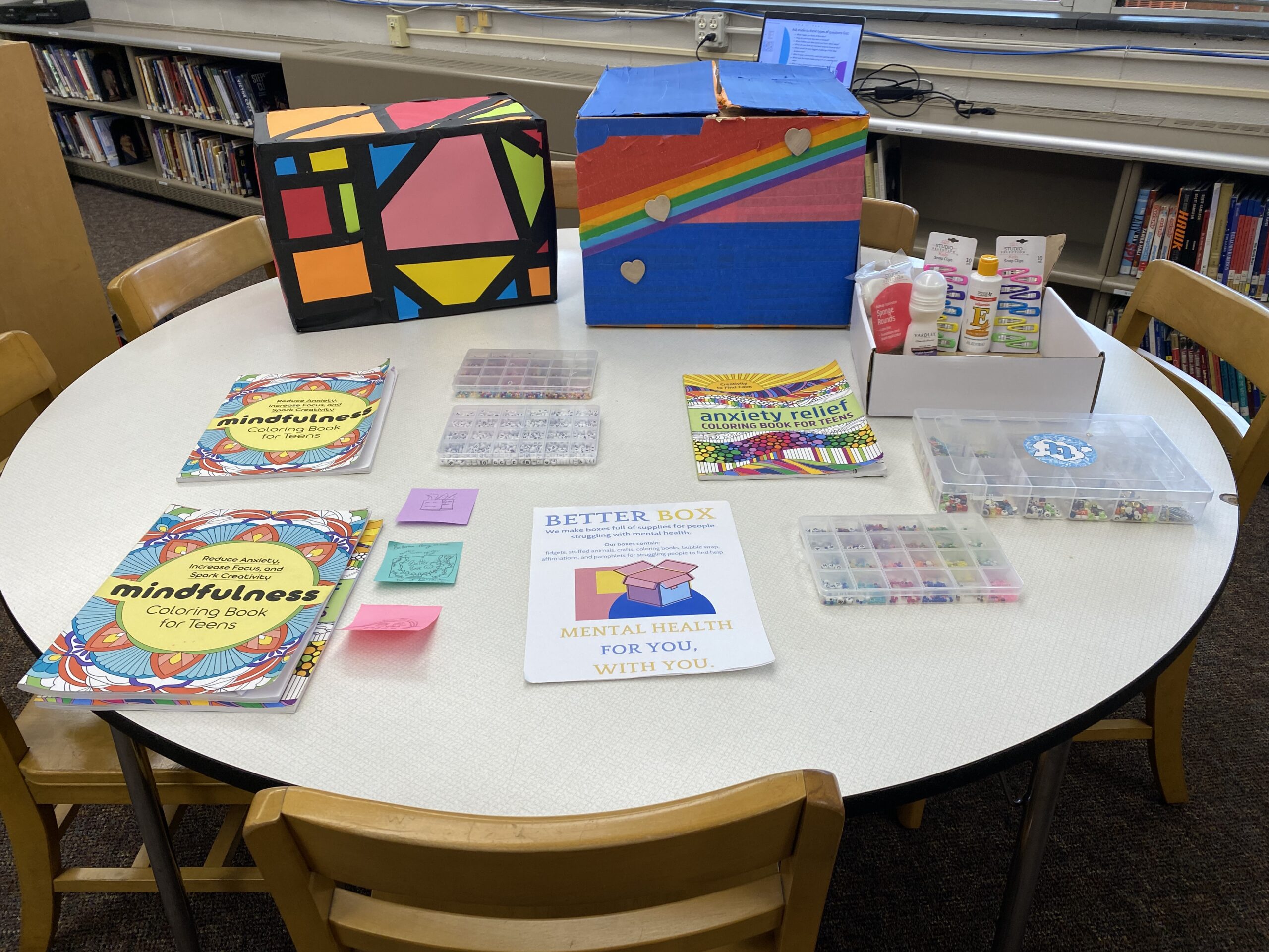 Two years ago Tessa brought the idea of Better Box to Camp What If with the hope to assist those in the community who may be struggling with their mental health. The idea is to have a box full of resources that can be checked out at the local library. These resources will include sensory coloring books, fidgets, professionals’ names and numbers, motivational phrases, and journals that could be taken or written in then left there to show others they are not alone.